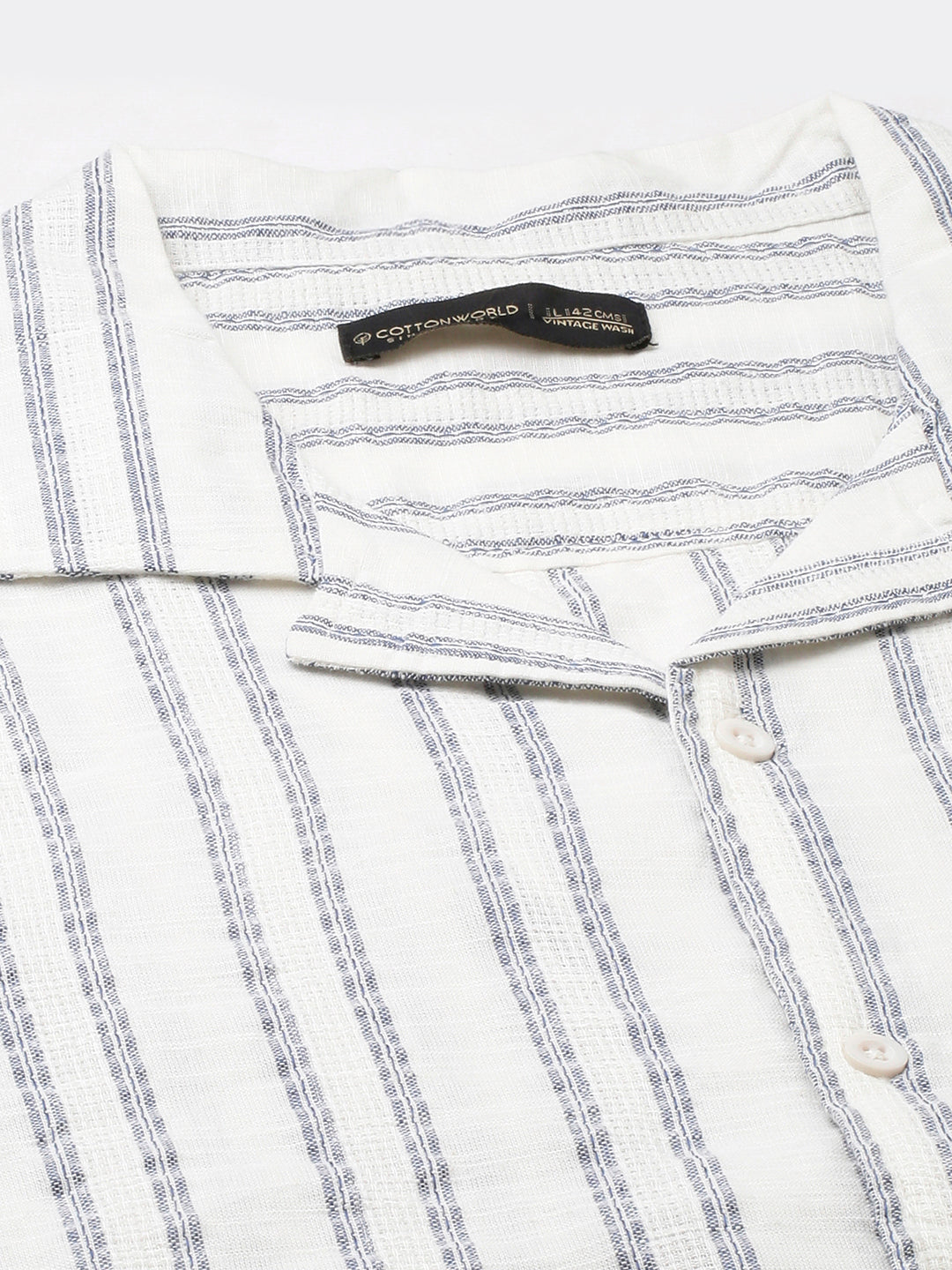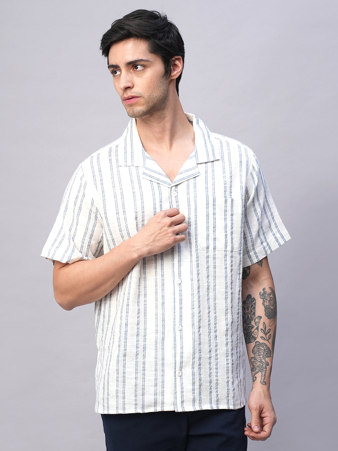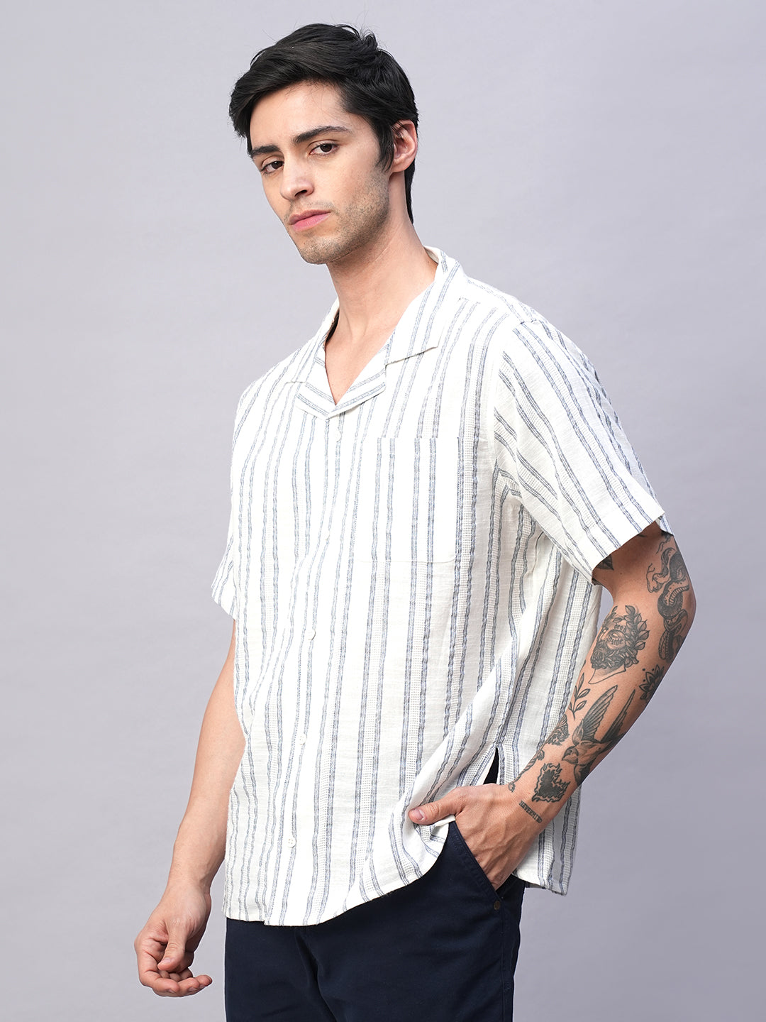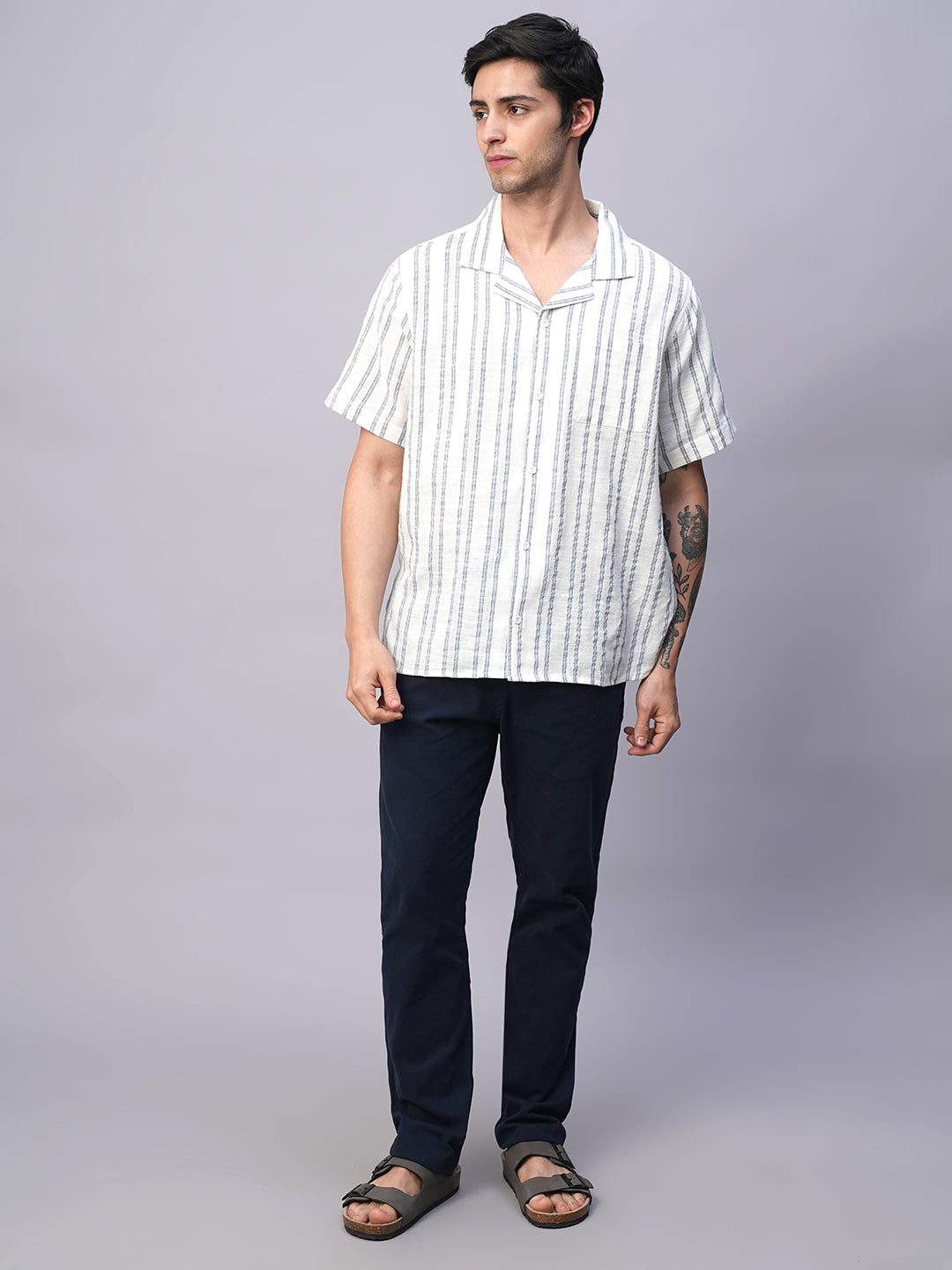 Men's White/Navy 100% Cotton Loose Fit Cuban Collar Shirt