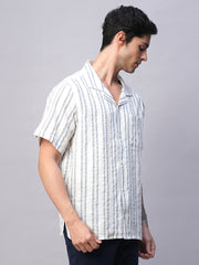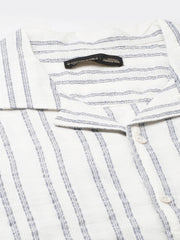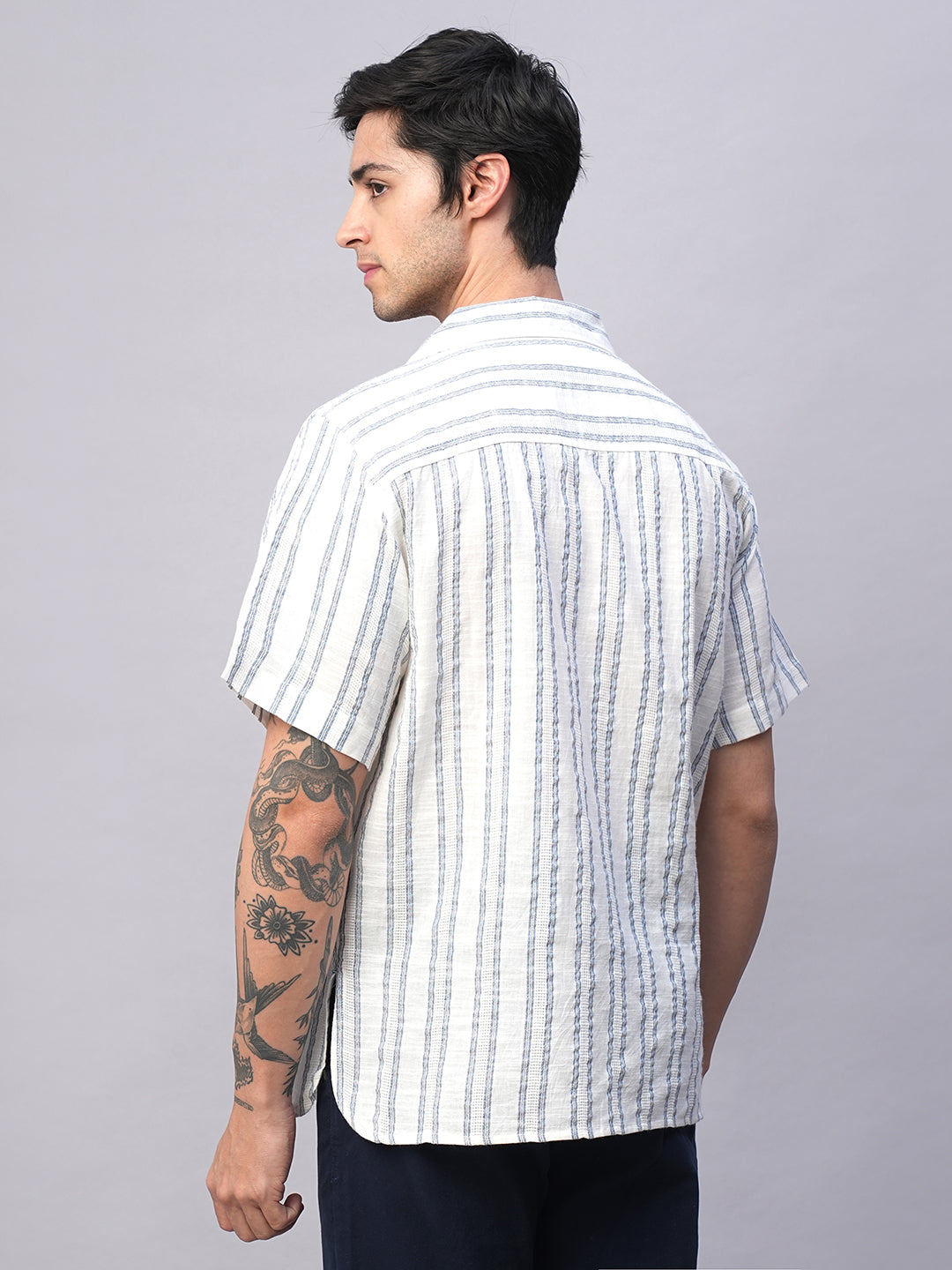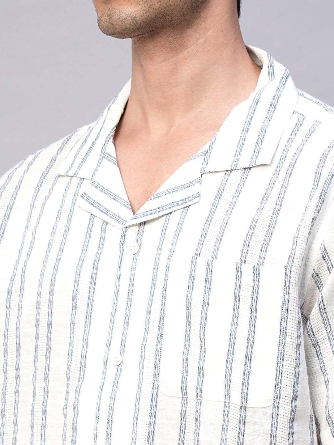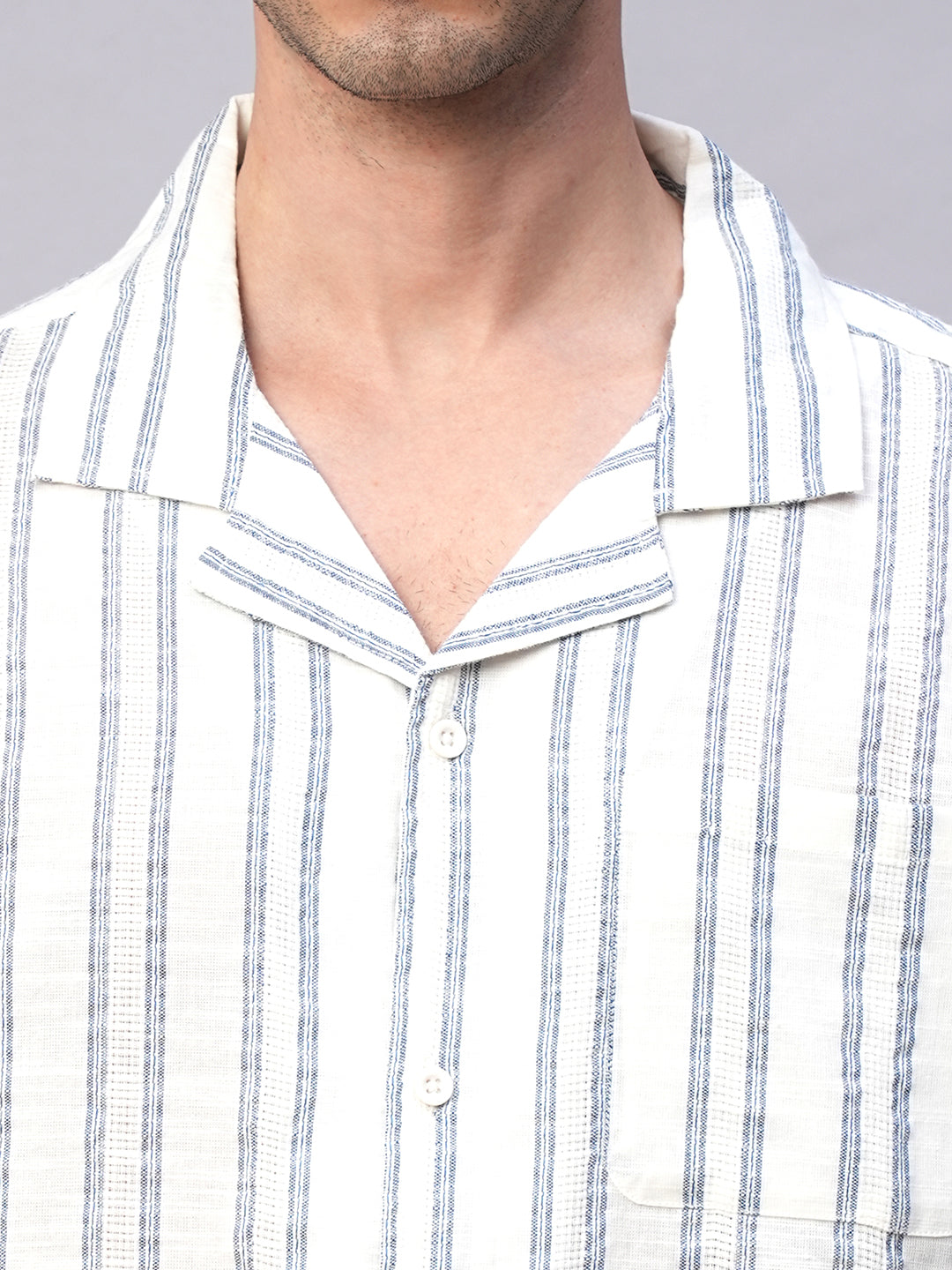 Men's White/Navy 100% Cotton Loose Fit Cuban Collar Shirt