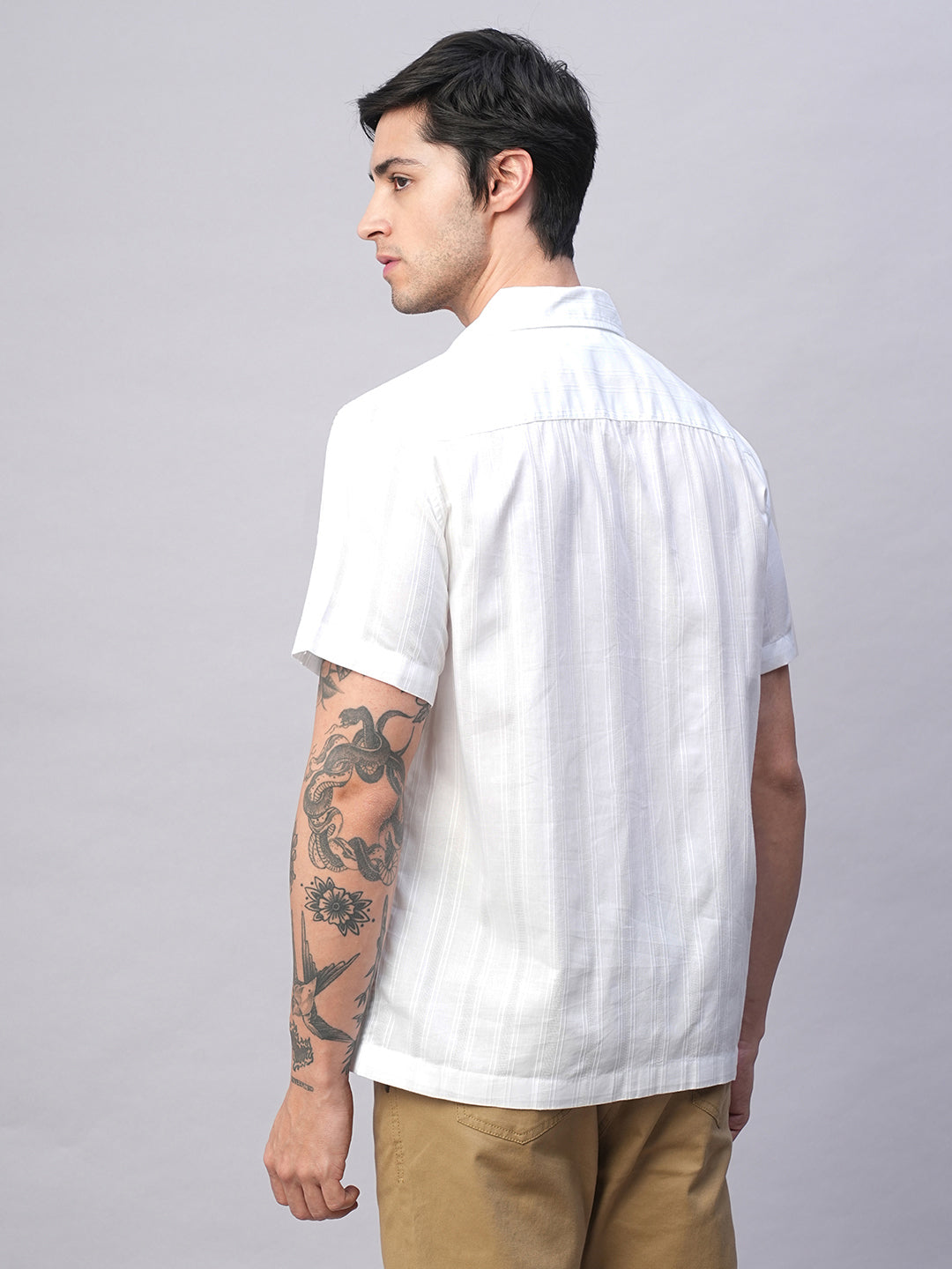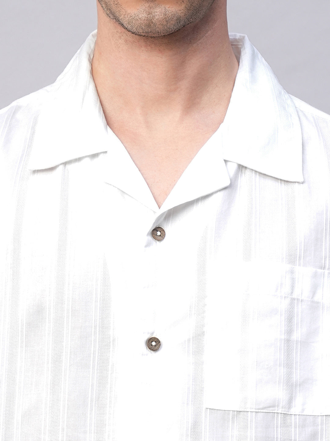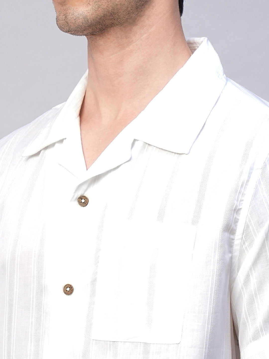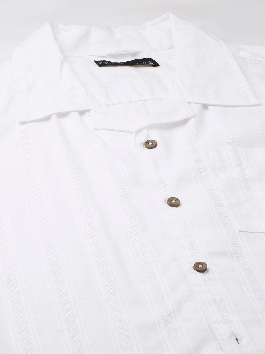 Men's White 100% Cotton Stripe Regular Fit Cuban Collar Shirt