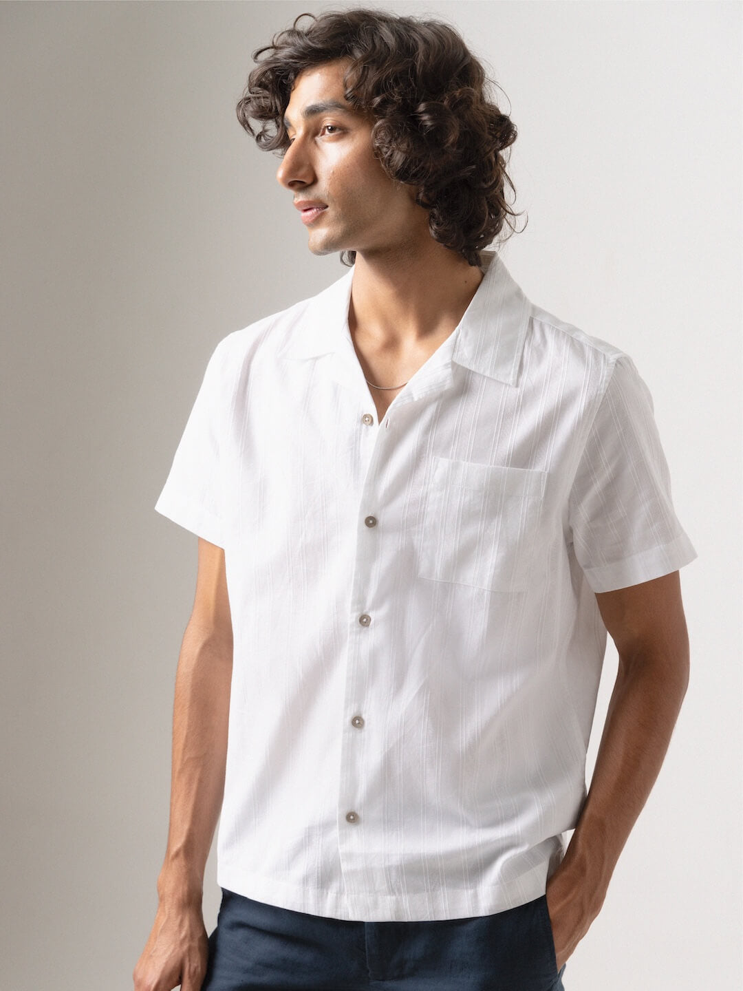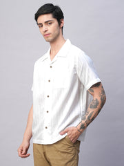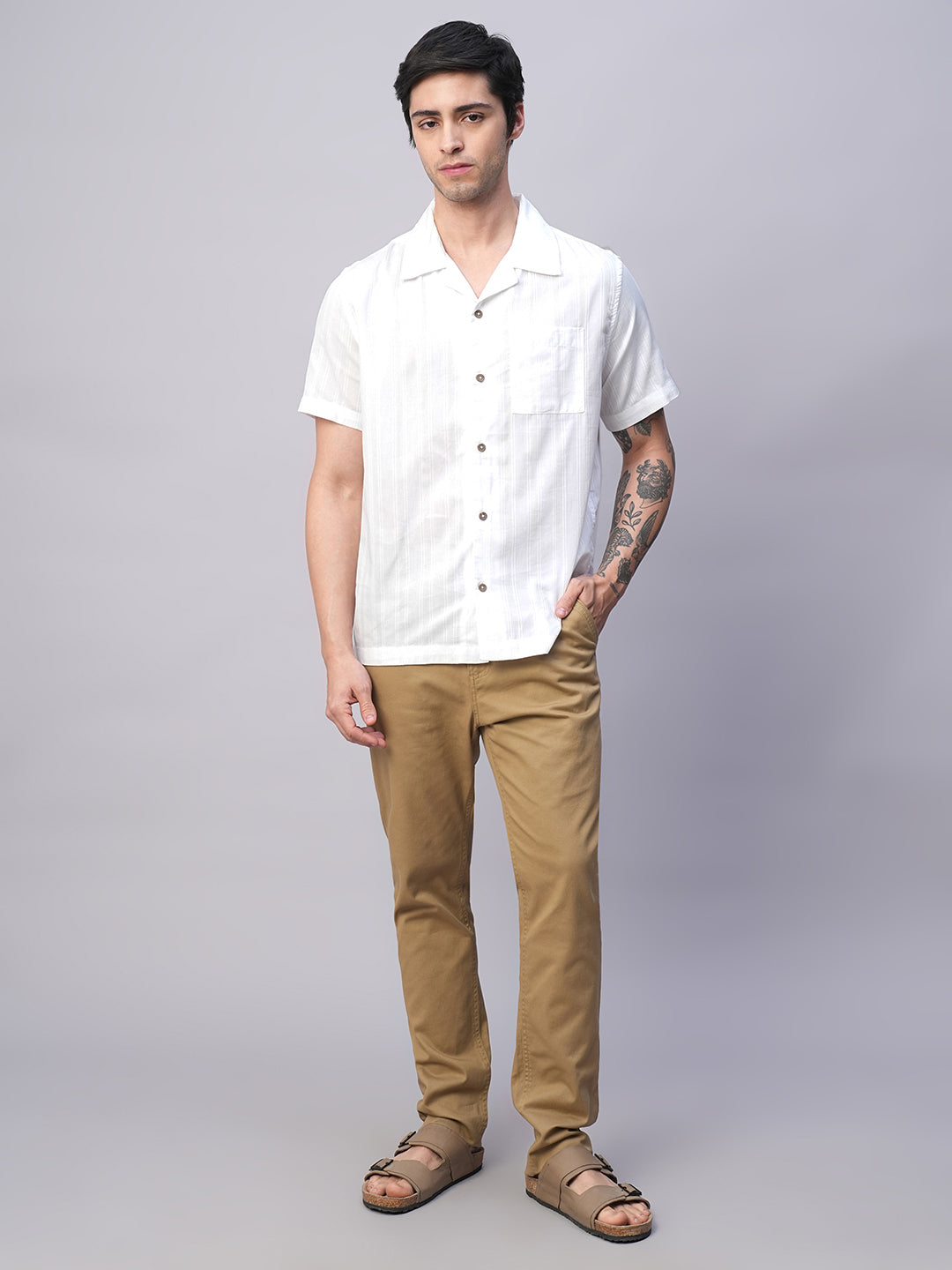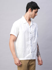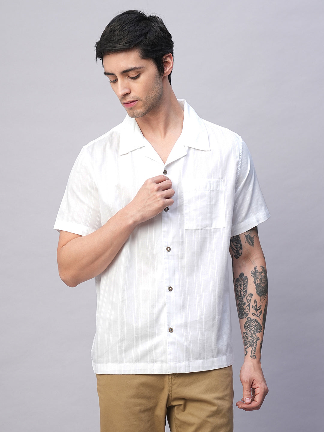 Men's White 100% Cotton Stripe Regular Fit Cuban Collar Shirt