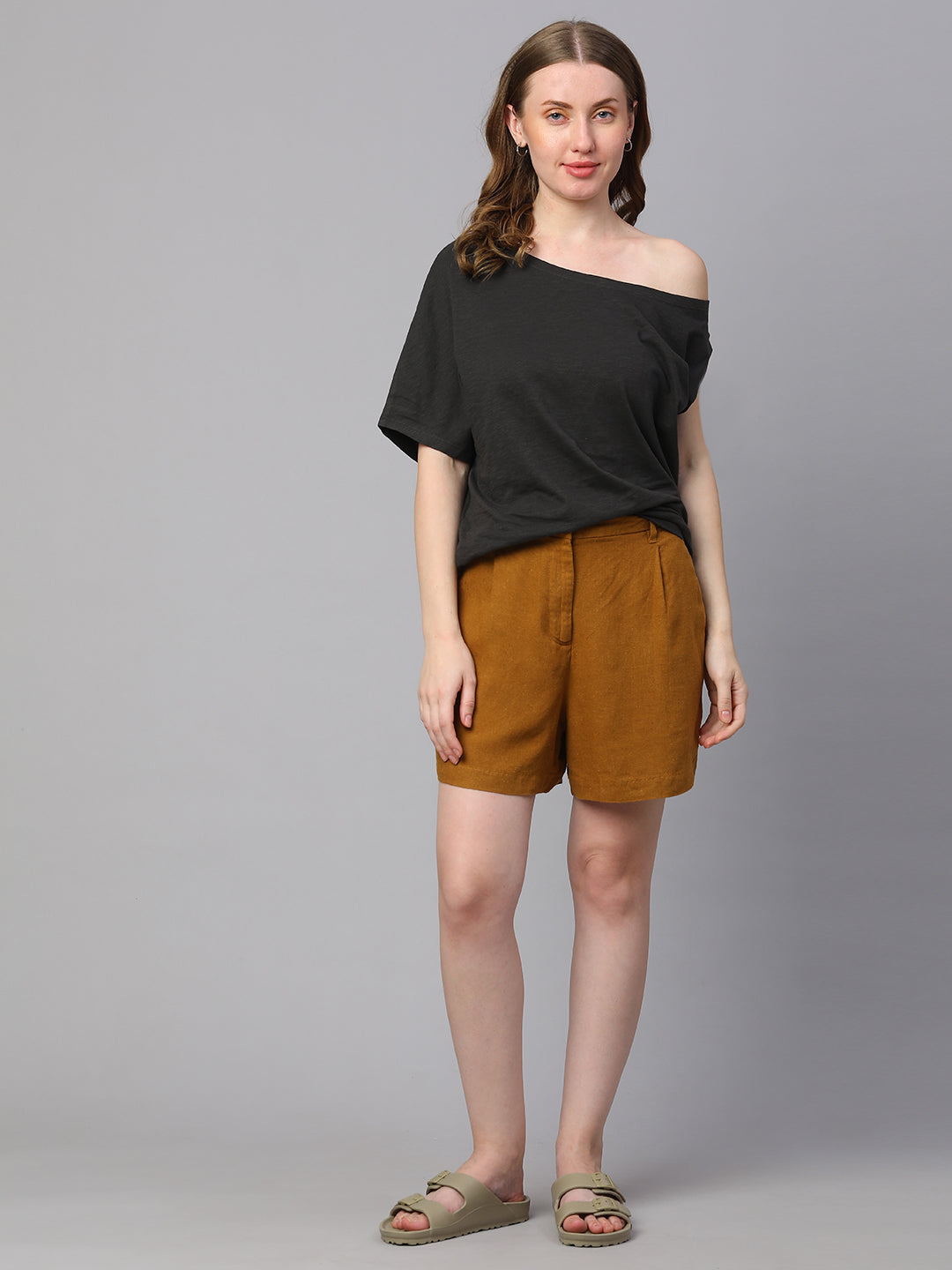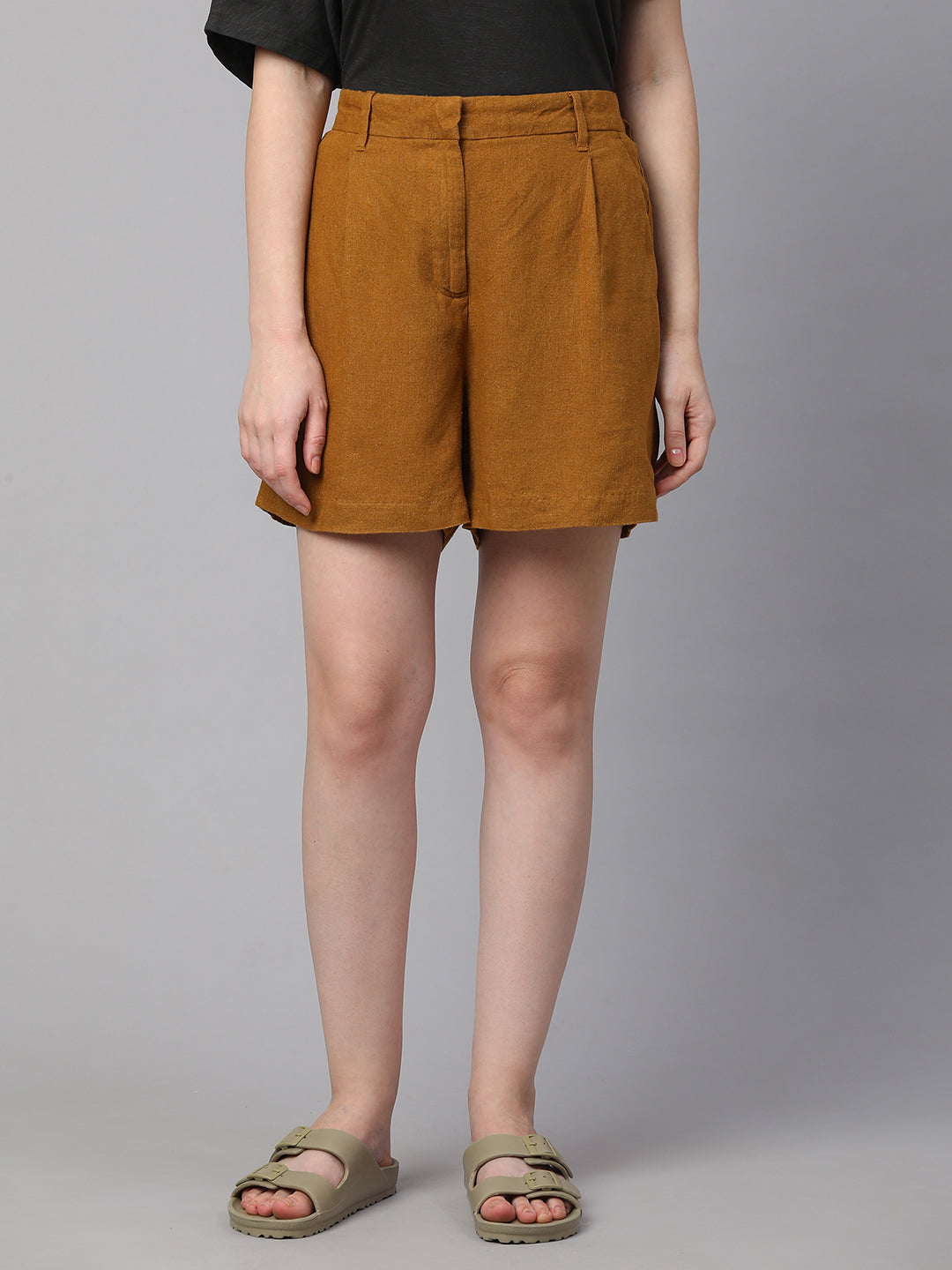 Women's Mustard Linen Viscose Regular Fit Shorts