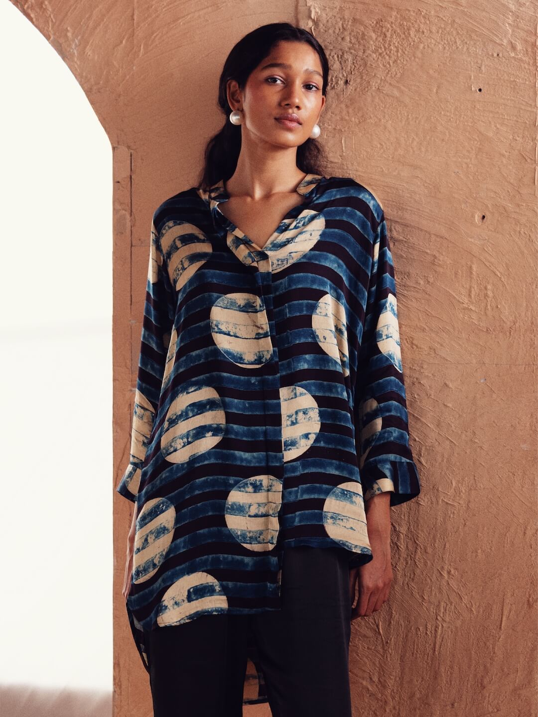 Our Rooted collection is a true blend of comfort and heritage. These loose-fit blouses are crafted from lightweight, viscose modal and celebrates the traditional Indian craftsmanship of Ajrak, a meticulous hand-block printing technique, where wooden blocks are used to stamp designs onto fabric. Any subtle imperfections in the print highlight the handcraft's authenticity, adding to its charm and uniqueness.