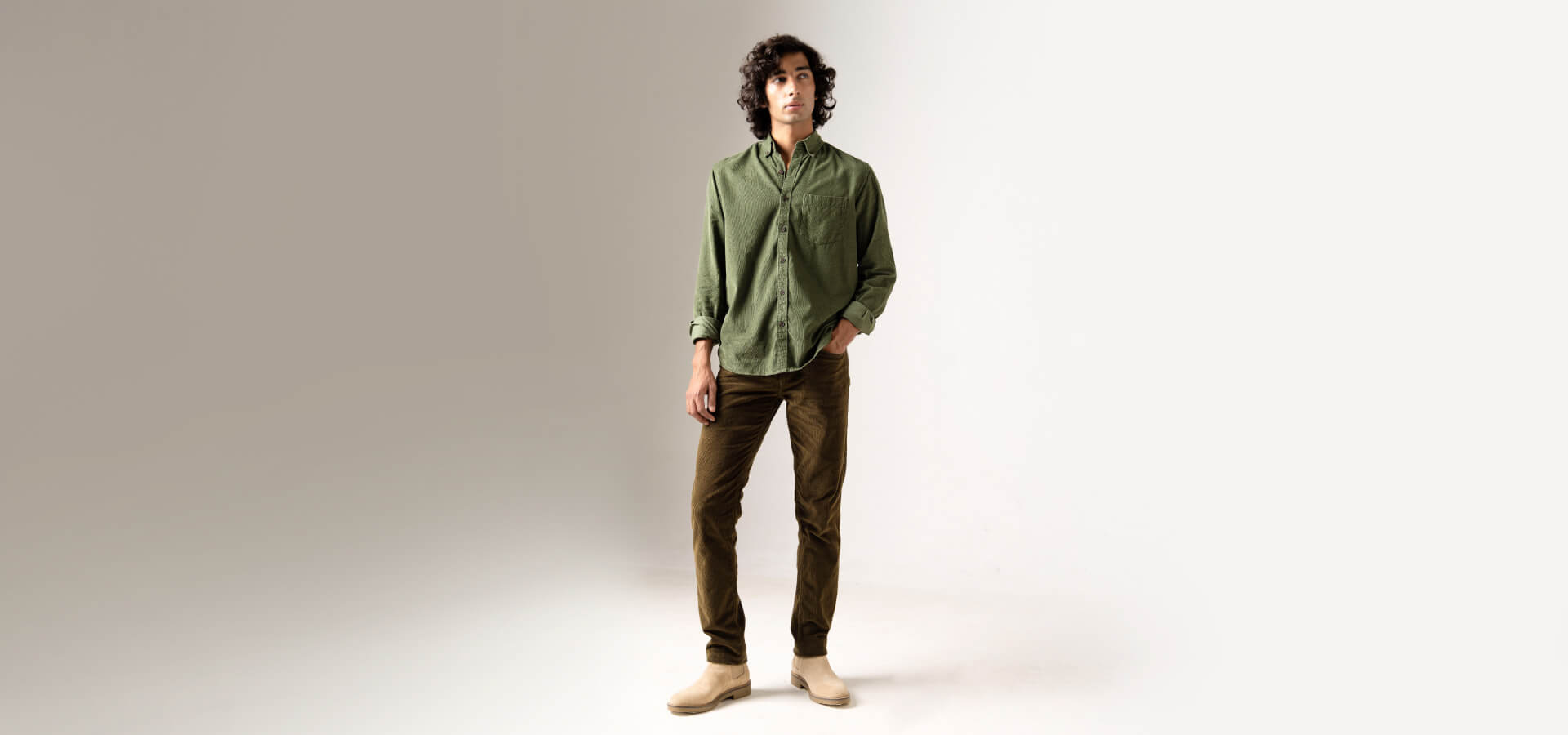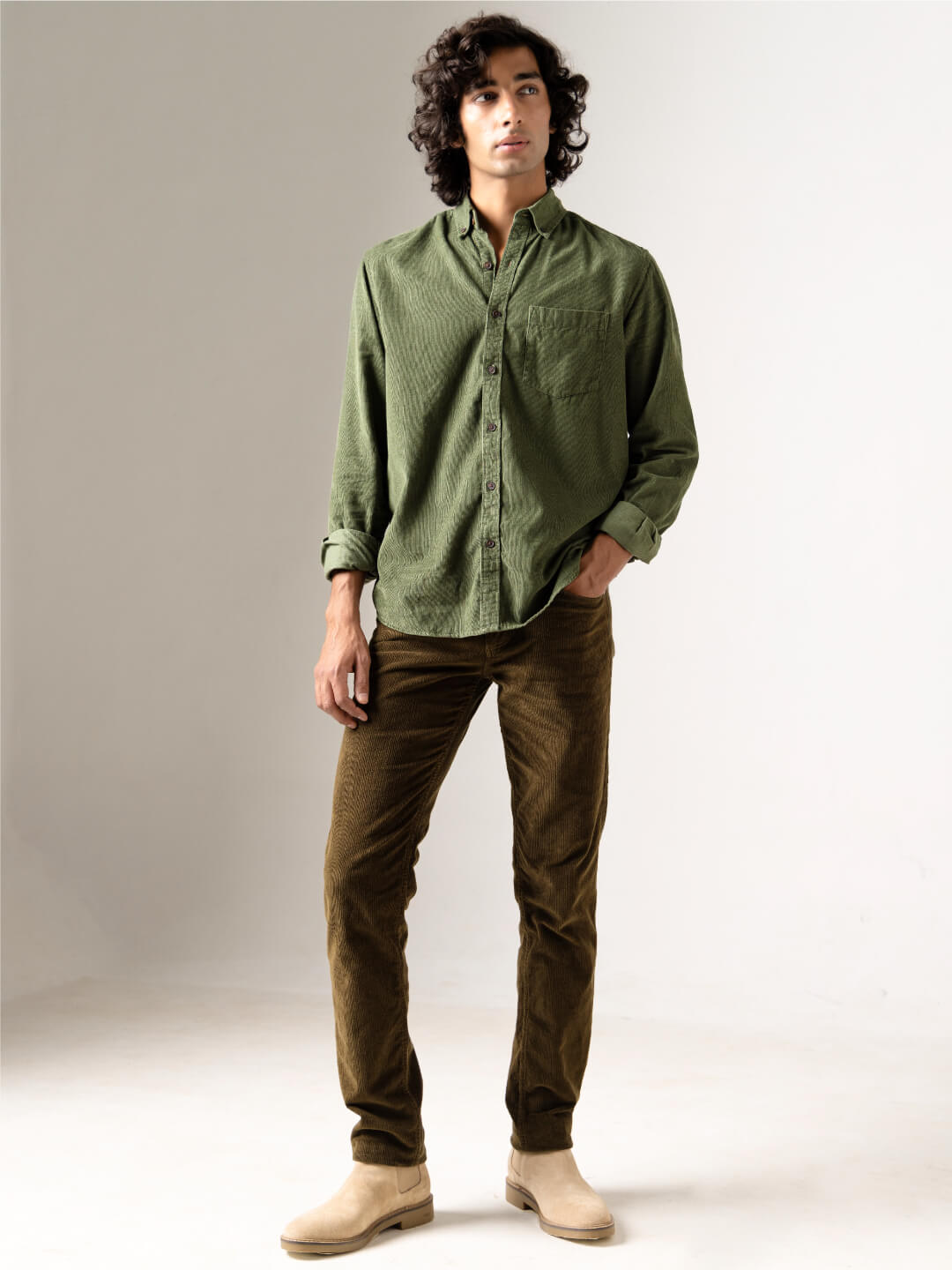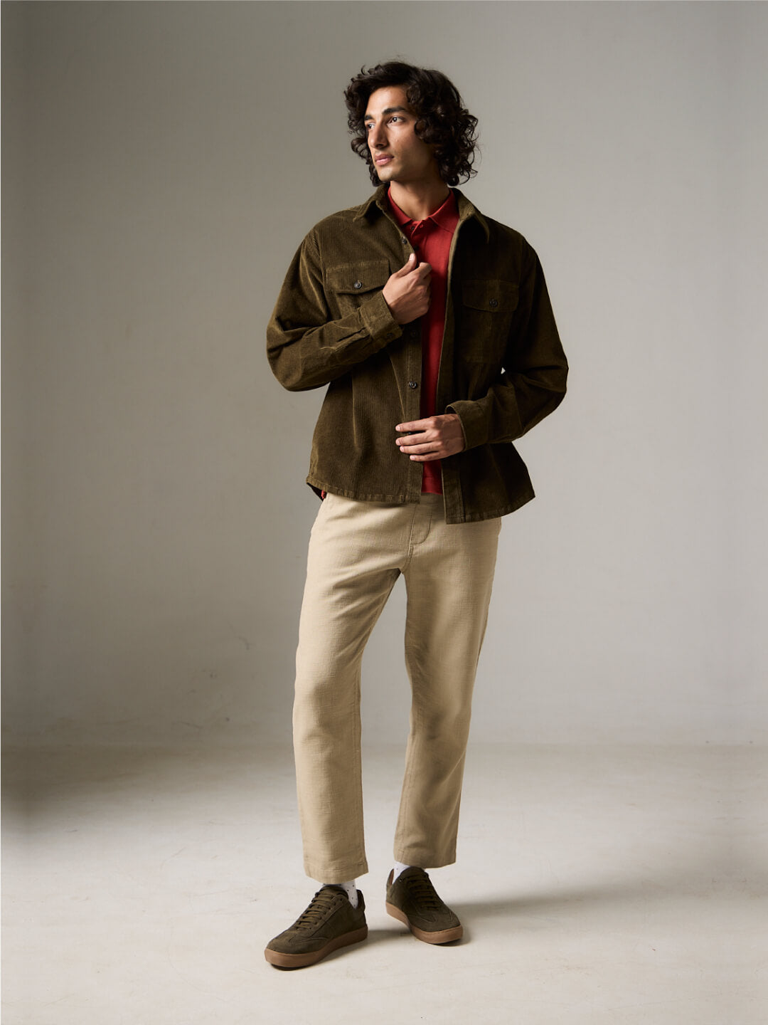 The corduroy shirt and pants bring rich texture and a structured feel, making a bold yet effortless statement.