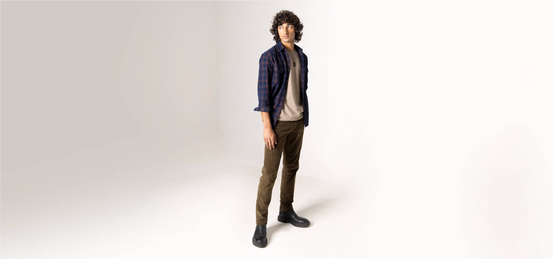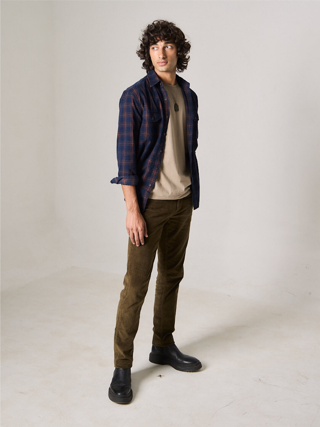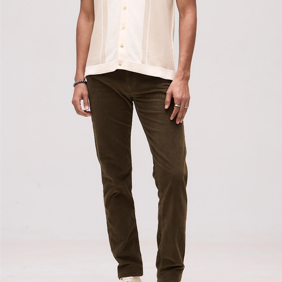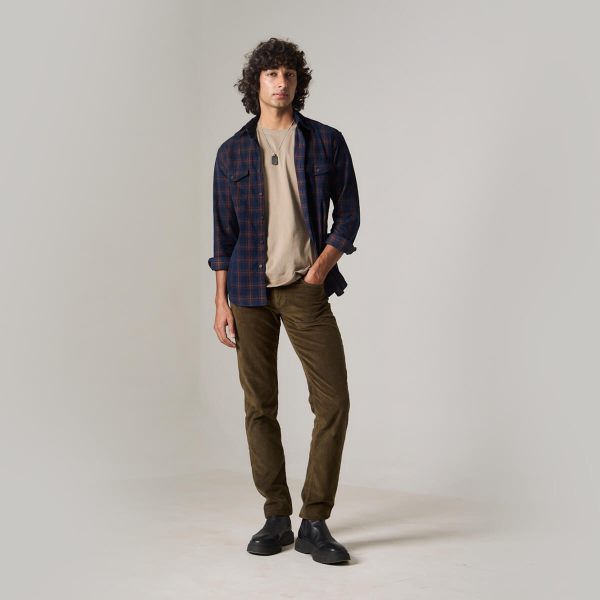 The corduroy shirt and pants bring rich texture and a structured feel, making a bold yet effortless statement.