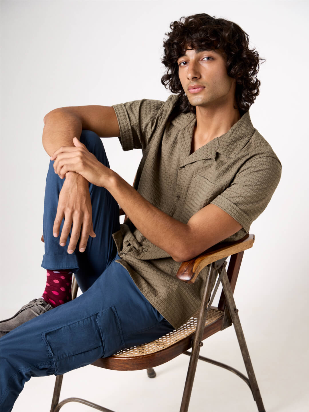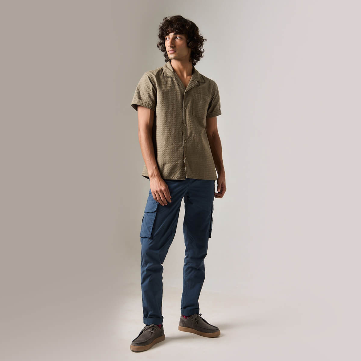 The 100% cotton dobby woven shirt offers subtle texture and breathability, paired with 6-pocket cargo pants for utility and ease. A blend of style and function.