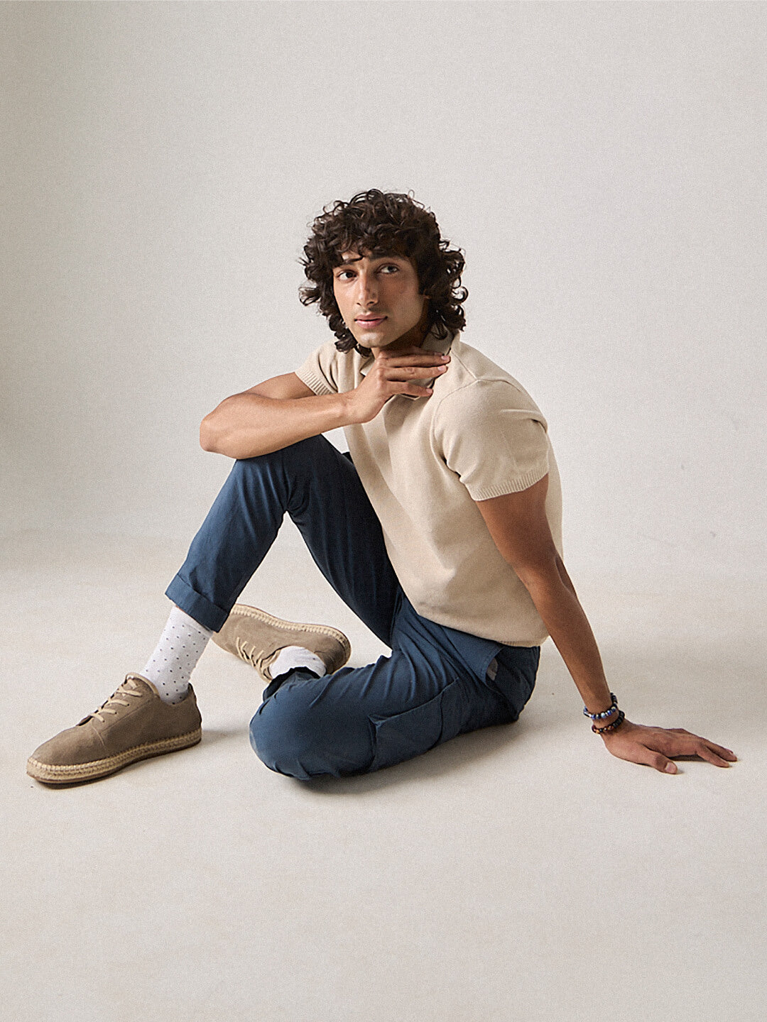 The 100% cotton knit polo brings softness and breathability, while the corduroy pants add texture and structure. A perfect blend of comfort and style.