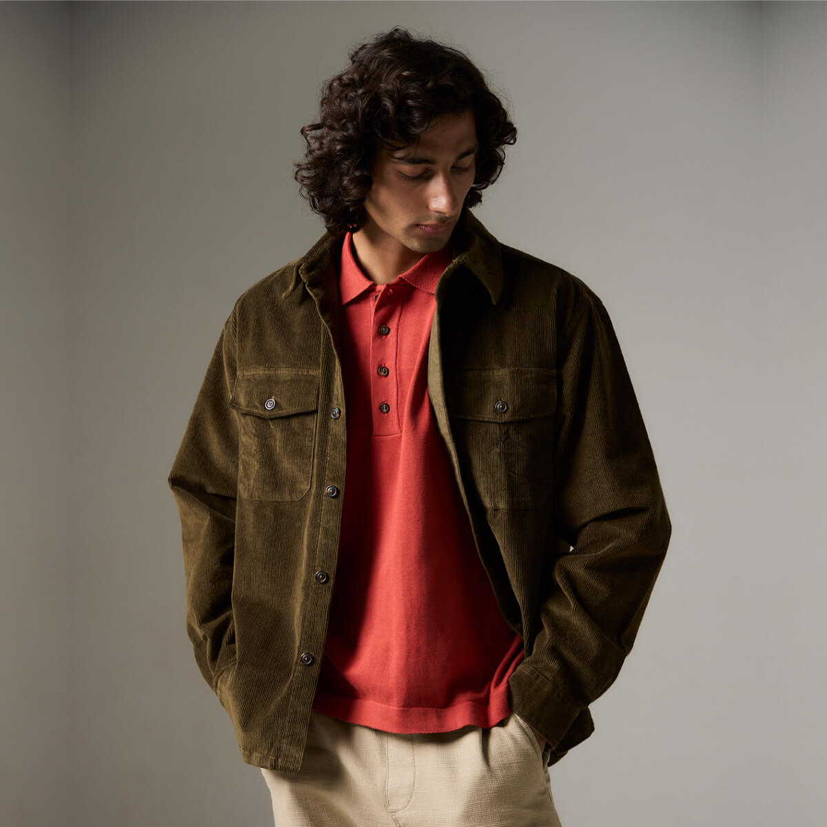 The corduroy jacket adds texture and warmth, layered over a classic polo tee for a smart yet effortless look.