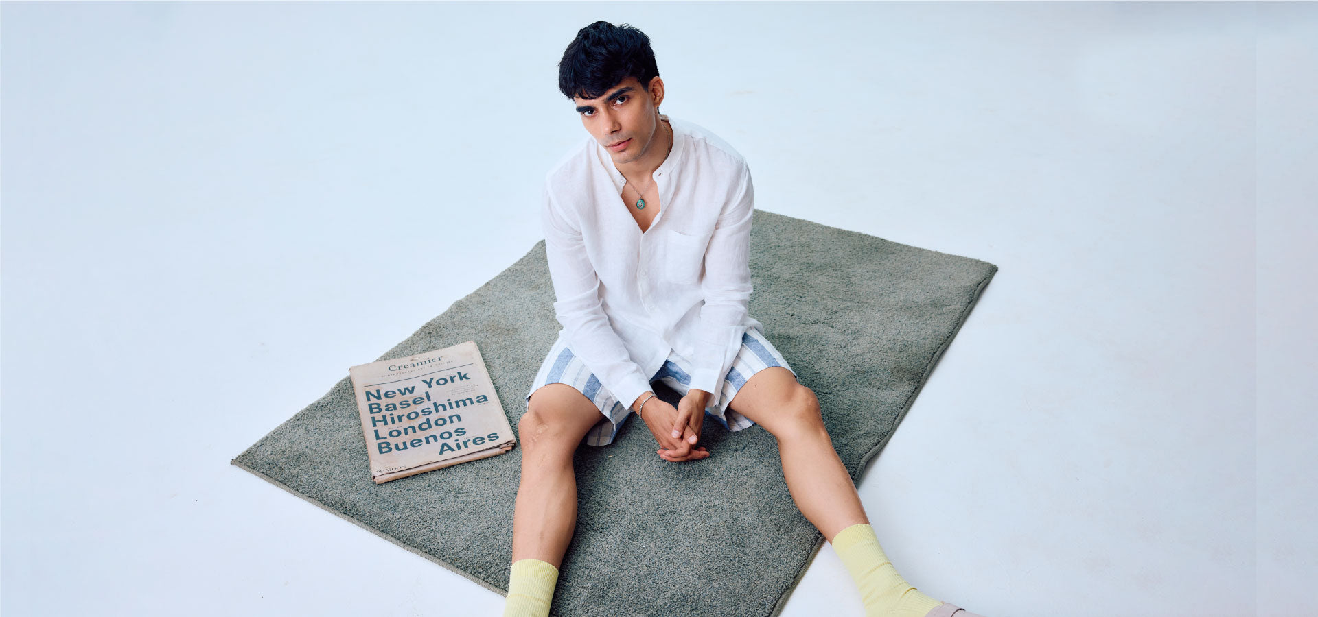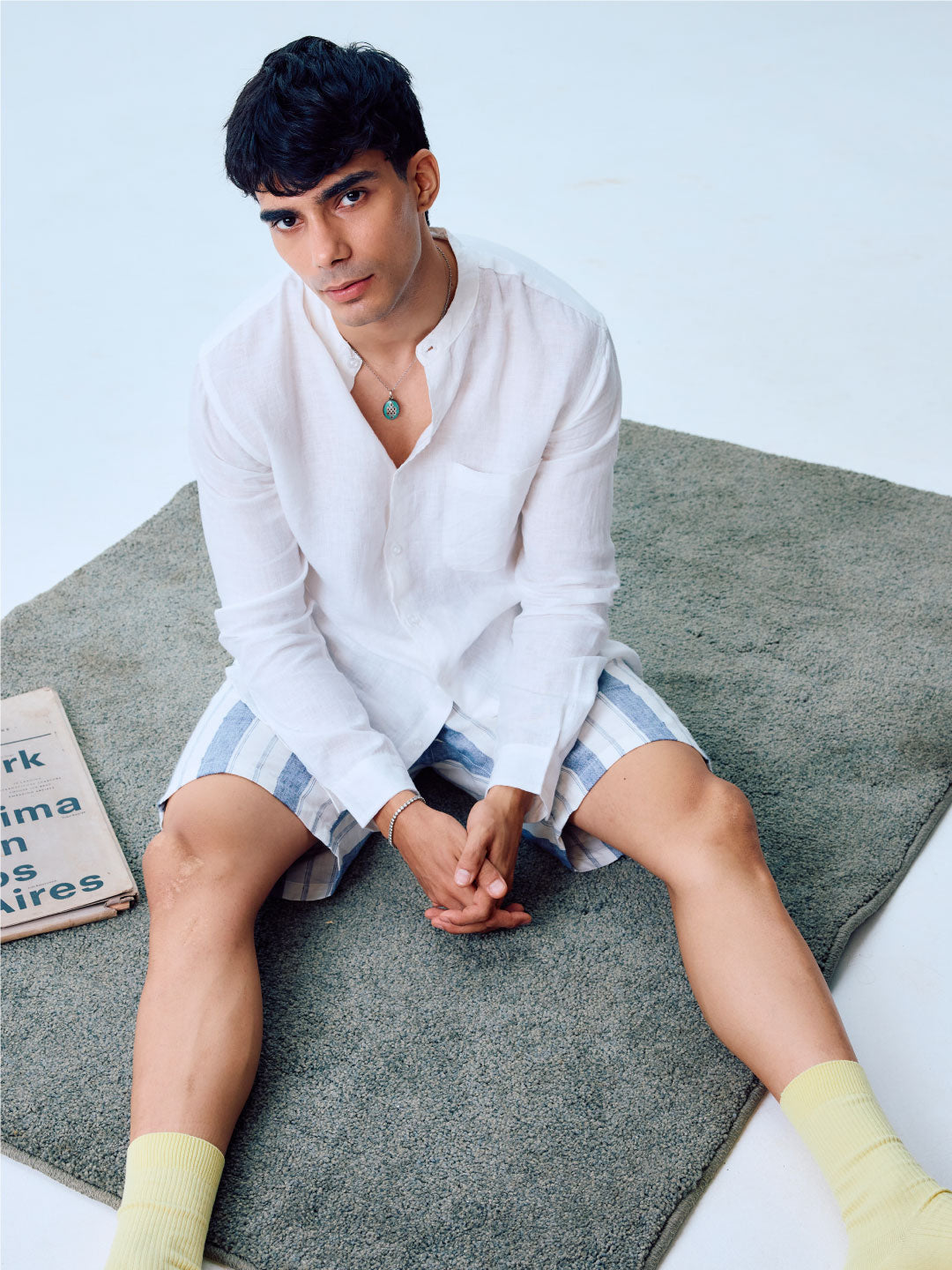 The navy cotton-linen shorts offer a relaxed fit, side pockets, and folded hems, perfect for laid-back summer days.