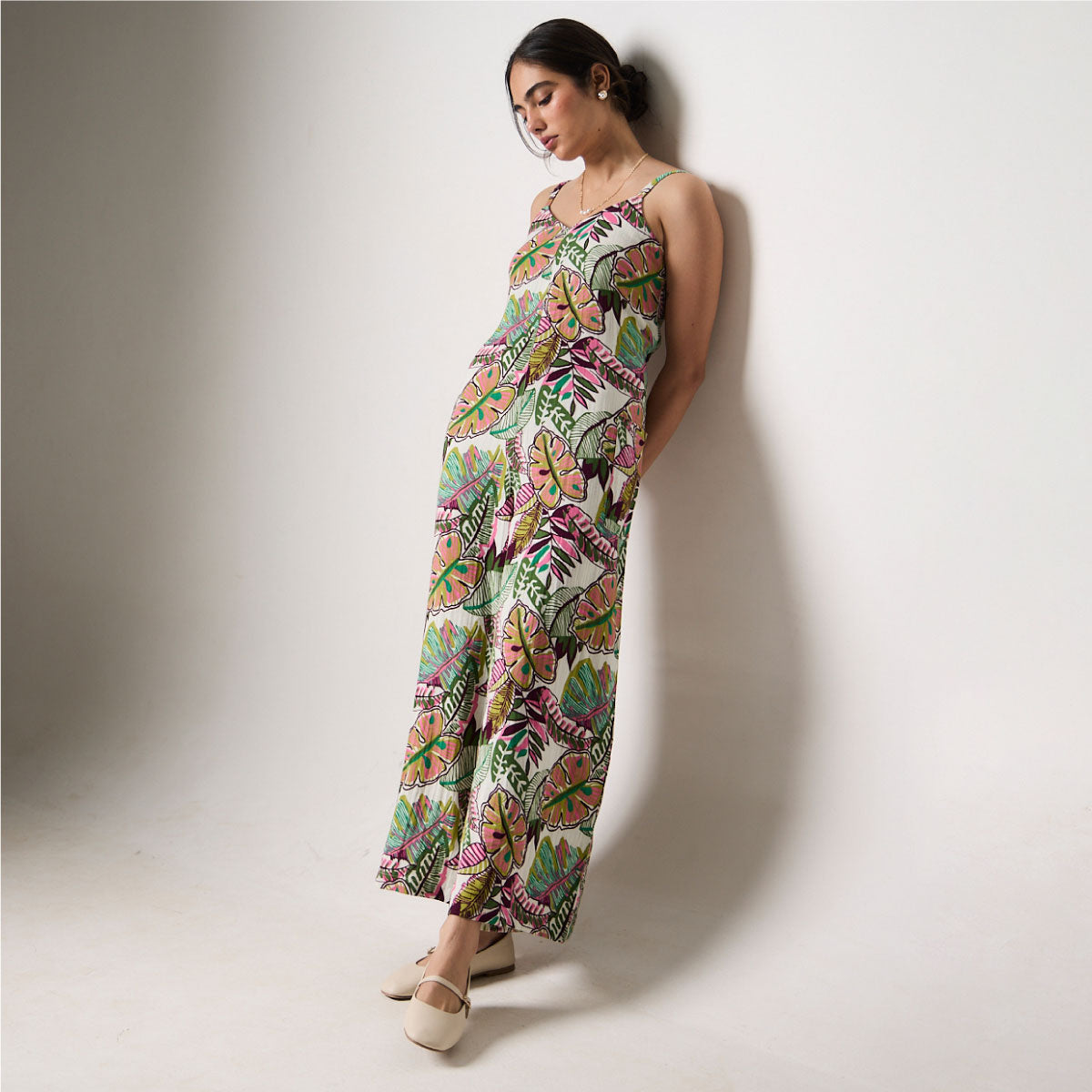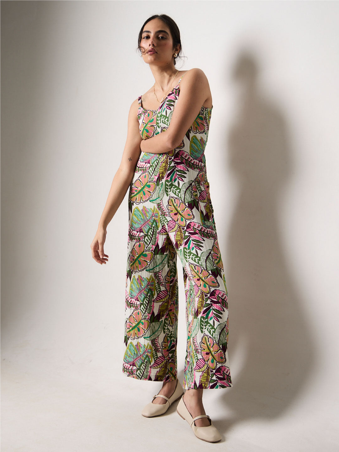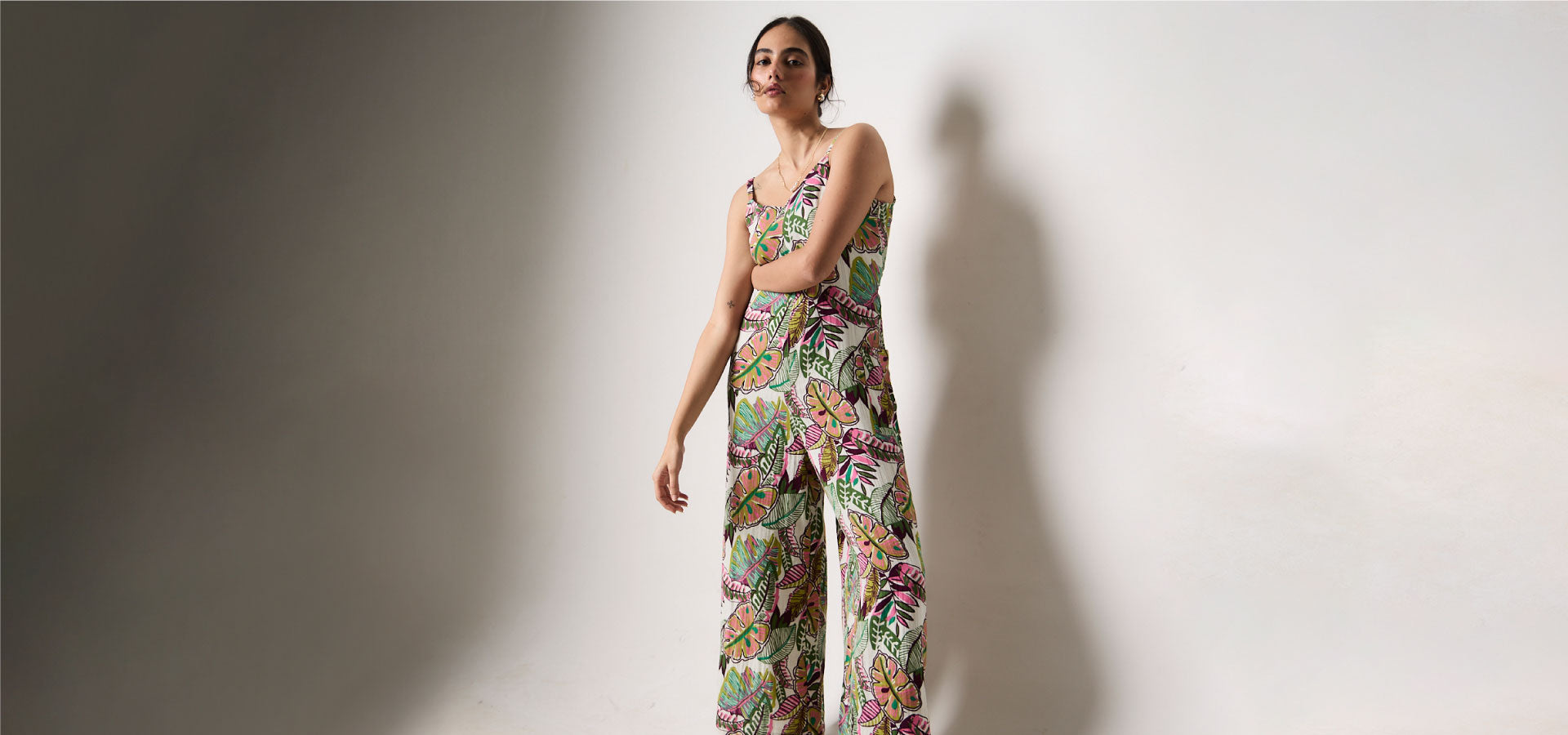 Bright and breezy in cotton, this multi-print jumpsuit combines comfort with a flattering V-neck and relaxed fit, your go-to for casual chic.