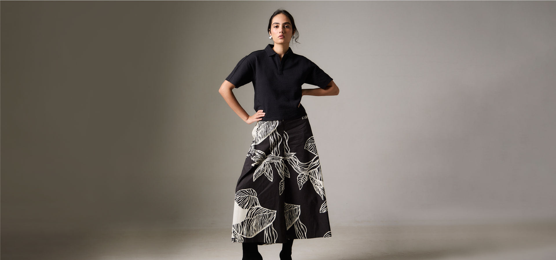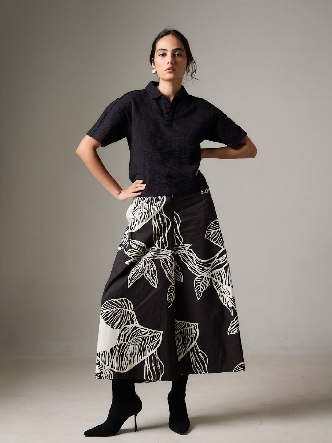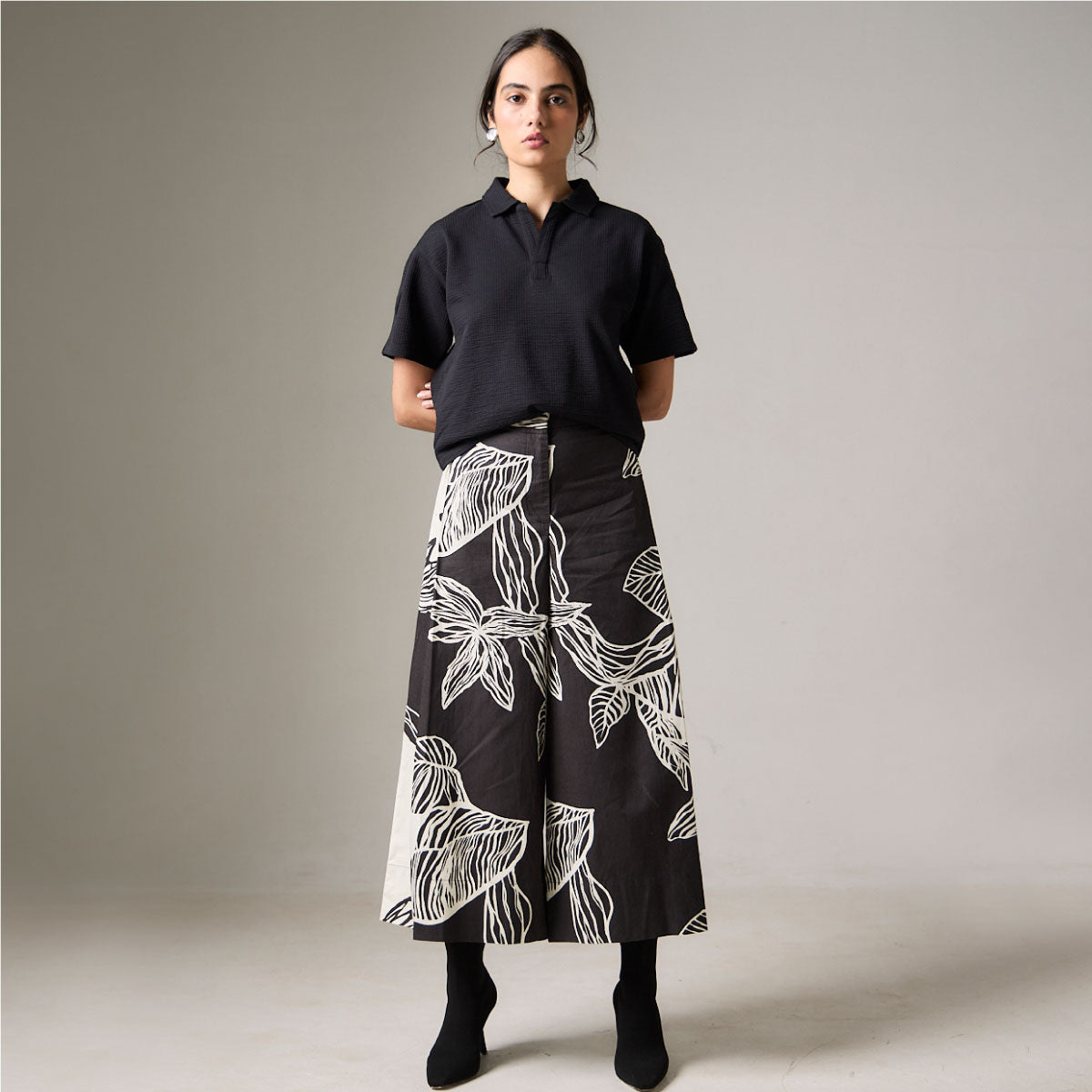 A classic black cotton polo tee paired with a bold print cotton culottes, effortless comfort with a statement twist for everyday style.
