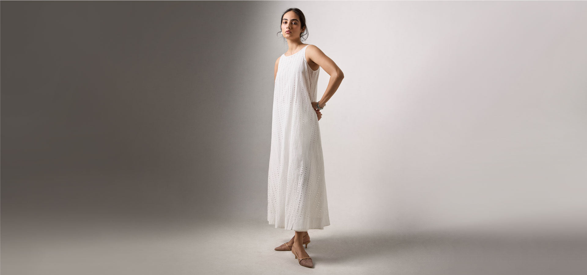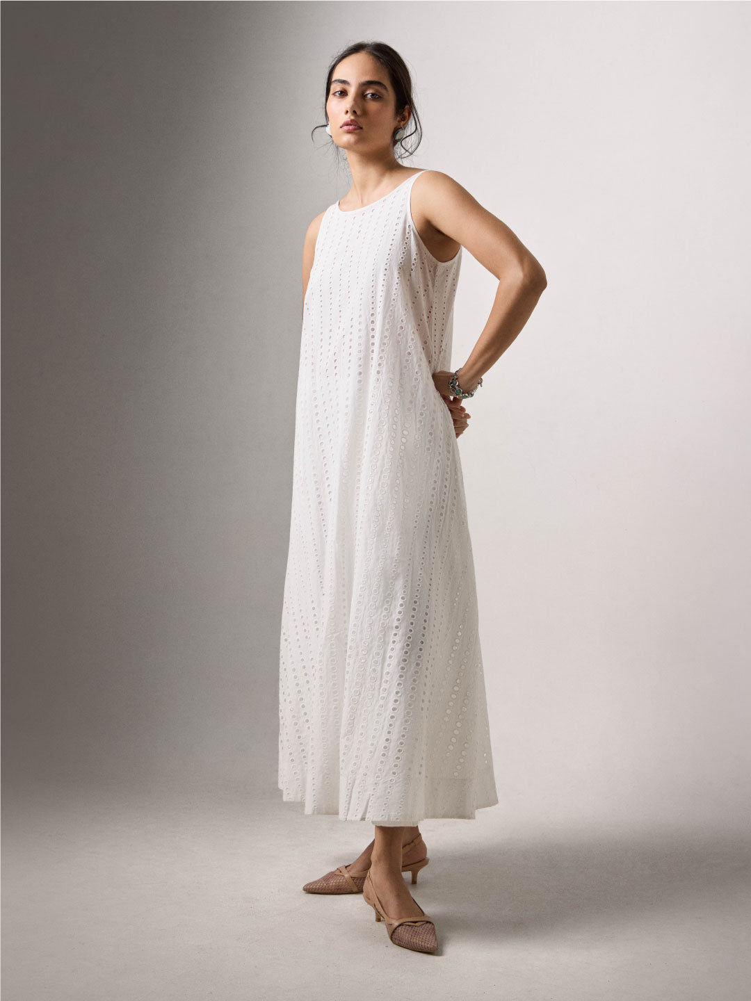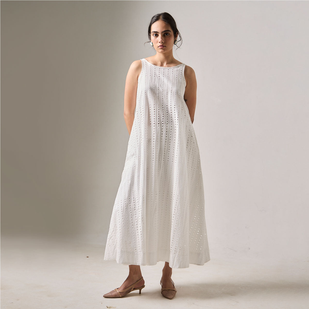 Crafted in 100% cotton hakoba, this sleeveless dress blends comfort with understated grace. A versatile semi-formal style with side seam pockets.