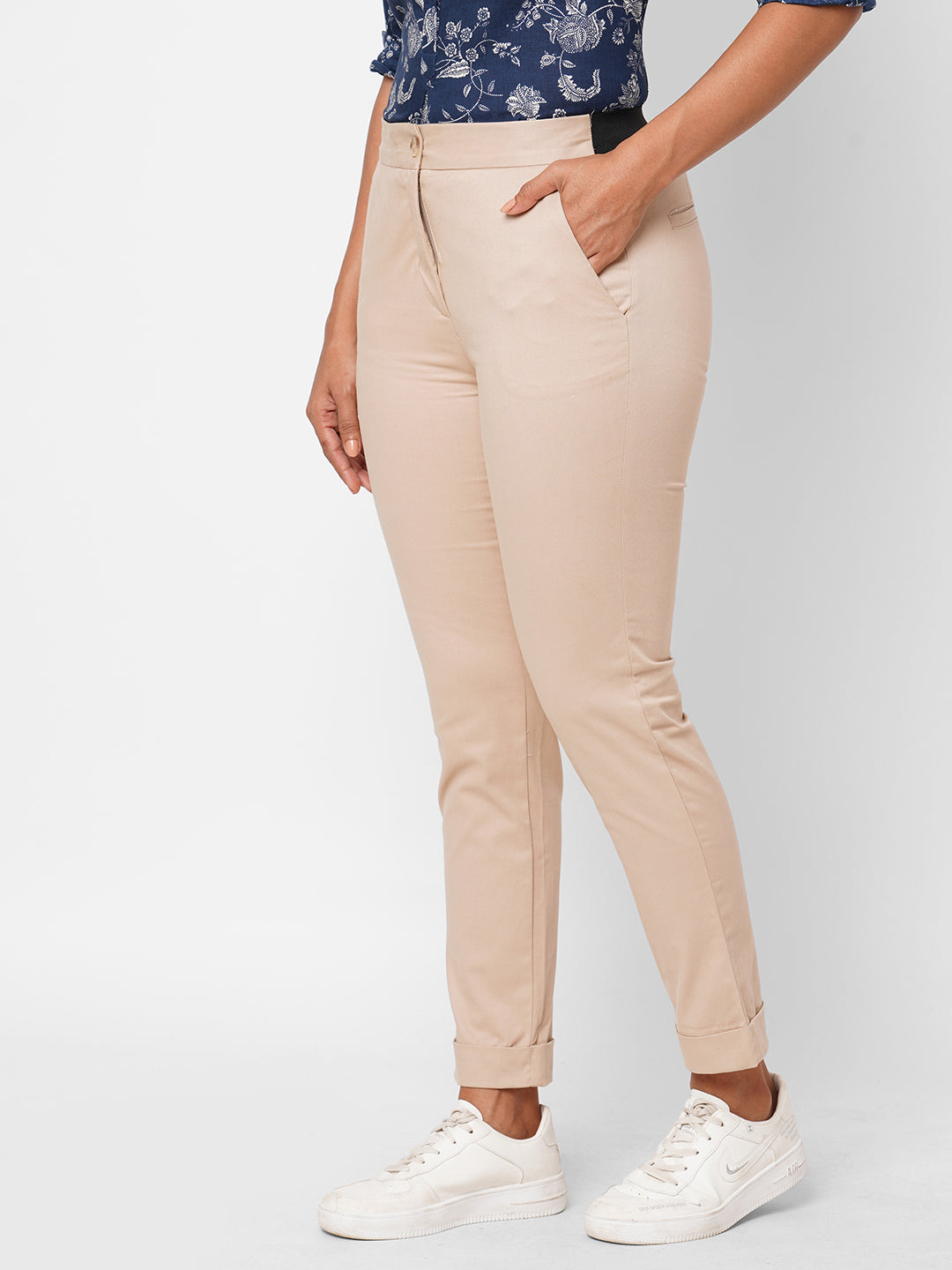 Tailored trousers in cotton and lycra weave with diagonal side pockets and a folded hem to complete the look. Sport these chic and sophisticated pants at work to have all eyes gazing at you. These skinny, slim-fit pants boast concealed elastic at the back and a clean zip and button on the front. These semi-formal pants nail the chic semi-formal look with tapered legs and a versatile shade. Slip into them and stay as effortless as you want.
